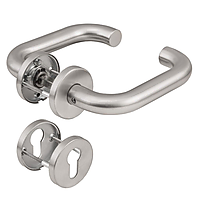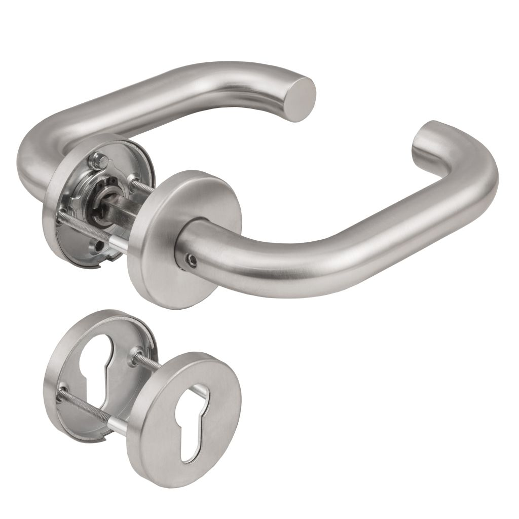 KRUK-KRUK GARNITUUR OP ROZET (HOUTEN DEUREN), RVS, U-KRUK, MET CILINDERROZETTEN