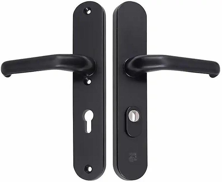 HMB M-Line Noir zwart Veiligheidsbeslag afgerond breed met PC72 in Kruk/Kruk uitvoering met kerntrekbeveiliging. Vastdraaibaar beslag met geveerde kruk ideaal voor renovatie. Geen verschil in draairichtingen en van hoogwaardige kwaliteit met extra lange schilden. De krukken zitten vast op het schild.