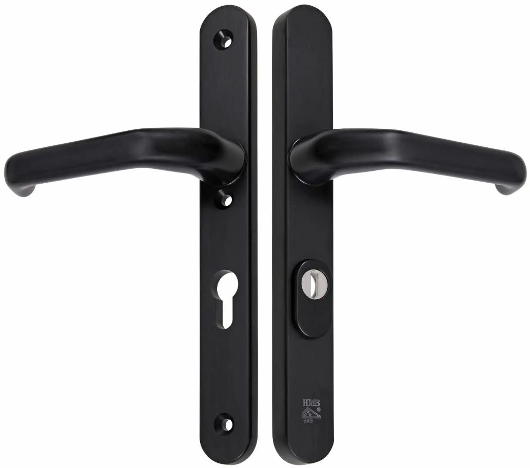 HMB M-Line Noir zwart veiligheidsbeslag afgerond smal met PC72 in Kruk/Kruk uitvoering met kerntrekbeveiliging. Chique mat zwarte kleur uniek en stijlvol design. Vastdraaibaar beslag met geveerde kruk en geen verschil in draairichting van hoogwaardige kwaliteit. Extra lange schilden met krukken vast op het schild. Ook geschikt voor renovatie.