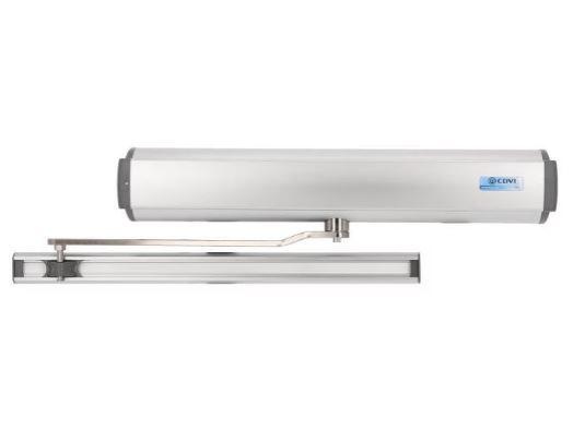 CDVI Digiway deurautomaat universele arm voor enkele deur. De Digiway deurautomaat van CDVI heeft een universele arm, die deuren tot 120 kg zowel dicht kan trekken als open kan duwen. De functie ‘Wind stop’ zal de deur gesloten houden wanneer er wind tegen drukt. De optie ‘obstakeldetectie’ wordt voorzien als veiligheidsmechanisme: indien de deur dicht gaat, maar er bv. een persoon in de deuropening staat, dan zal de deur automatisch weer open gaan.