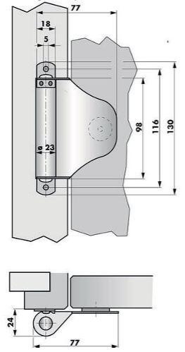 De instelbare sluitkracht wordt overgebracht d.m.v. een drukplaat die over een, op de deur bevestigde, zelfsmerende schijf glijdt. Openingshoek tot ca. 90°, geschikt voor links- en rechtsdraaiende deuren.
