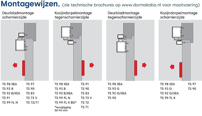 Dormakaba TS99 vrijloop deurdranger. Dankzij de vrijloopfunctie van de TS 99 kunt u brand- en rookwerende binnendeuren openen en sluiten zonder enige merkbare vorm van weerstand. Door de vrijloopfunctie blijft de deur vrij beweeglijk, alsof er geen deurdranger op de deur gemonteerd werd. Alleen in geval van brand of stroomuitval zal de deurdranger de deur automatisch sluiten. Bij het openen van de deur wordt de vrijloopfunctie reeds vanaf een deuropeningshoek van > 0° geactiveerd. De TS 99 is geschikt voor deurbreedtes tot 1.250 mm en is hierdoor ideaal voor gebruik in ziekenhuizen, verzorgingstehuizen, centra voor mindervaliden, m.a.w. plaatsen waar barrièrevrijheid een grote rol speelt.