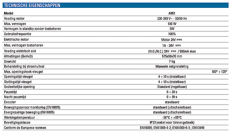 | 1. | De A951 is een deuropener voor geruisloos en soepel openen van binnendeuren tot 100 kg |