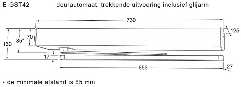 Maasland Deurautomaat voor enkele deuren voor deurgewicht tot 150kg inclusief arm. GST is een trekkende deurautomaat en de GSD42 is de duwende deurautomaat. Deze geluidsarme enkele draaideurautomaat is een universele automaat geschikt voor deuren tot 150 kg in trekkende of duwende uitvoering en zelfsluitend bij spanningsuitval. De deurautomaat kan door diverse impulsgevers worden bediend, variërend van infrarood en radiografisch tot drukknoppen. Ook elektrische vergrendelingen kunnen vanuit de automaat worden aangestuurd, met instelbare tijdvertraging voor het openen. Programmering kan via de deurautomaat zelf om diverse opties te selecteren zoals push and go en foutcode meldingen etc. Daarnaast kunnen alle bewegingseigenschappen worden ingesteld. Inverse instelling mogelijk; bij spanningsuitval gaat de deur op veerkracht open i.p.v. dicht.