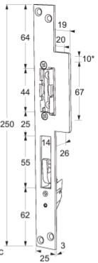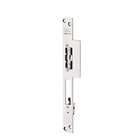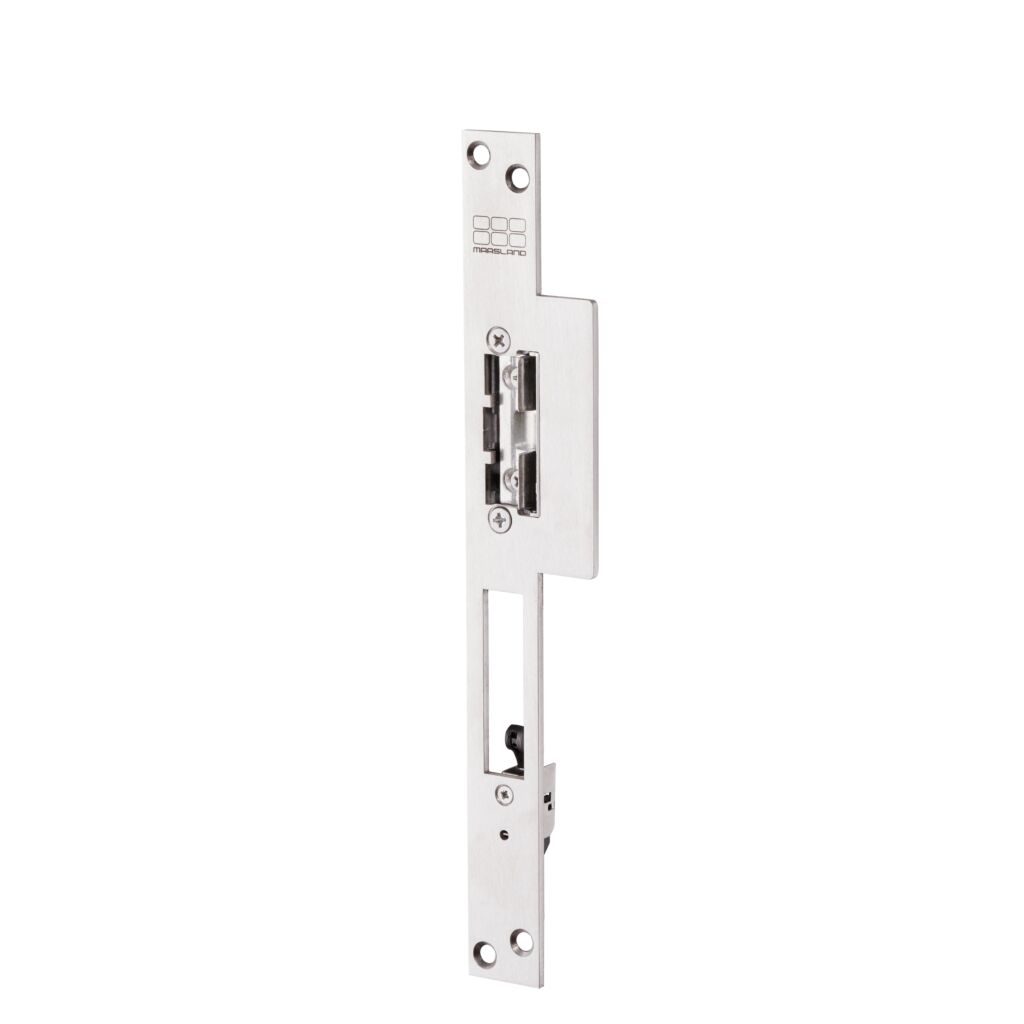 Lange lipsluitplaat met nachtschootsignalering. Verkrijgbaar in diverse varianten. Arbeidsstroom of ruststroom en vrijzetpal, openhoudfunctie of dagschootsignalering. Elektrische deuropener met geïntegreerde schootgeleider en universele spoel die in het kozijn, tegenover de dagschoot van een mechanisch slot wordt ingebouwd, om deze te vergrendelen of te ontgrendelen. De schootgeleider duwt de dagschoot uit de schootvanger van de elektrische deuropener zodat, zonder lelijke uitsparingen in het kozijn, de deur kan worden ontgrendeld. De lange lipsluitplaat is geschikt voor houten kozijnen en heeft een uitsparing voor de nachtschoot, zodat deze mechanisch kan worden vergrendeld. Tevens is de sluitplaat voorzien van een nachtschootsignalering. Hiermee kan men zien of de deur op het nachtslot is gedraaid of kan bijvoorbeeld het alarm worden ingeschakeld.