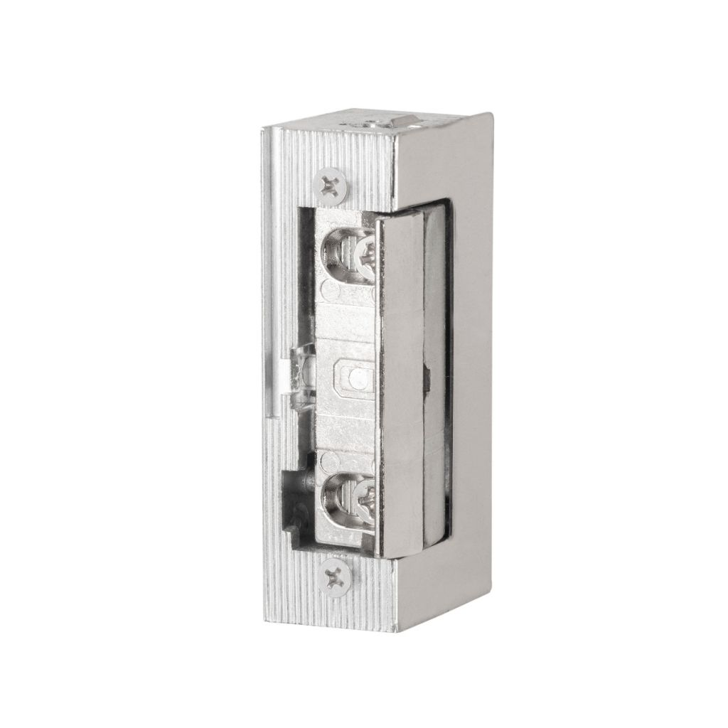 Maasland A00B Inbouw arbeidsstroom elektrische deuropener voorzien van axiale 4 mm verstelbare schootvanger welke buiten de behuizing draait. De deuropener wordt in het kozijn tegenover de dagschoot van een mechanisch slot ingebouwd om deze te vergrendelen of te ontgrendelen. Geleverd zonder sluitplaat.