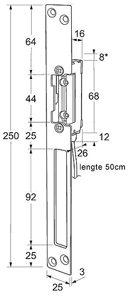 Maasland elektrische deuropener waterdichte IP68. speciaal voor buiten toepassingen als voordeuren garagedeuren en poorten. De waterbestendige deuropener wordt tegenover het mechanische slot ingebouwd om zo de dagschoot te ver- of ontgrendelen. De lange sluitplaat heeft een uitsparing voor de nachtschoot, zodat deze mechanisch kan worden vergrendeld.