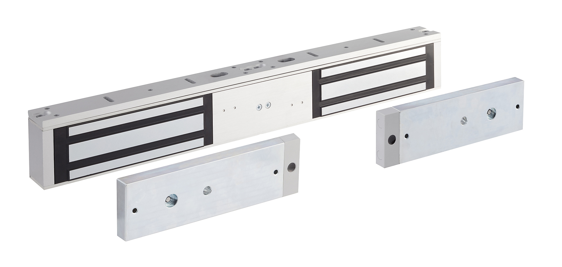 Sterke vergrendeling bestaande uit een dubbele magneet en twee ankerplaten die op het kozijn en deur worden gemonteerd. Als de ankerplaat tegen de magneet aan wordt gedrukt en de spanning staat op de magneet dan vergrendelt deze. Door de spanning te onderbreken wordt de magneet ontgrendeld. Standaard voorzien van spoel- en deurstandsignalering, timer en LED indicatie. Geschikt voor 12V= en 24V= en horizontaal of verticaal te monteren.