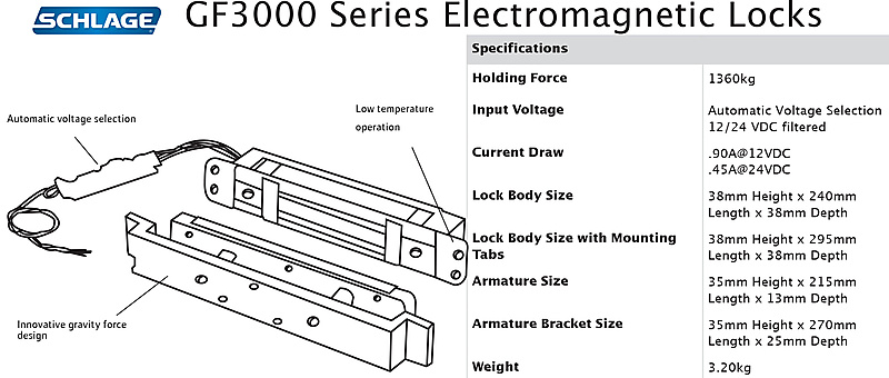 Schlage provides the most complete selection of electromagnetic locks in the industry. The GF3000 Series Shear Lock features a patented design offering advances over any Shear Lock on the market. Unique mounting features provide a floating action of both the lock assembly and the armature. This design allows the magnet assembly to move towards the armature during the locking process.In this manner, the GF3000 is able to overcome gaps of up to 6mm without current inrush. Once engaged, the Shear Lock provides 1360kg holding force without high operating temperatures normally associated with other Shear Locks. A microprocessorbased control module provides advanced electronic features. This circuitry automatically senses and adjusts input voltage, allowing for operation from 12 to 24 volt DC power sources.