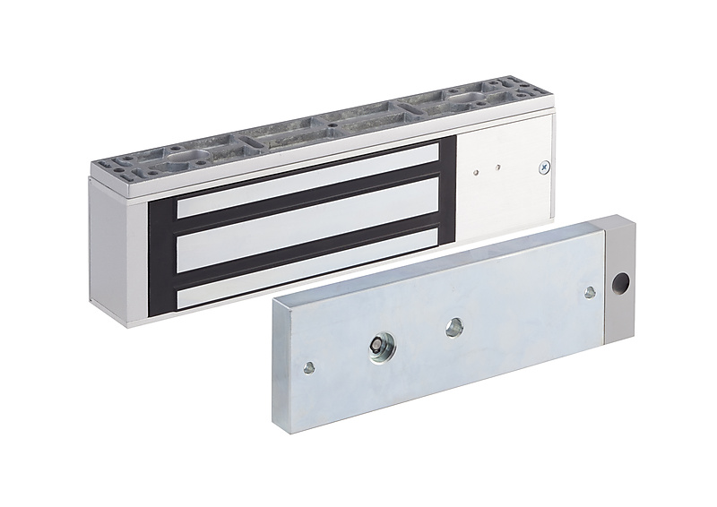Maasland Elektromagneet 37SSM. Sterke kleefmagneet vergrendeling bestaande uit een magneet en een ankerplaat die op het kozijn en deur worden gemonteerd. Als de ankerplaat tegen de magneet aan wordt gedrukt en de spanning staat op de magneet dan vergrendelt deze. Door de spanning te onderbreken wordt de magneet ontgrendeld. Standaard voorzien van spoel- en deurstandsignalering, timer en LED indicatie. Geschikt voor 12V= en 24V= en horizontaal of verticaal te monteren.