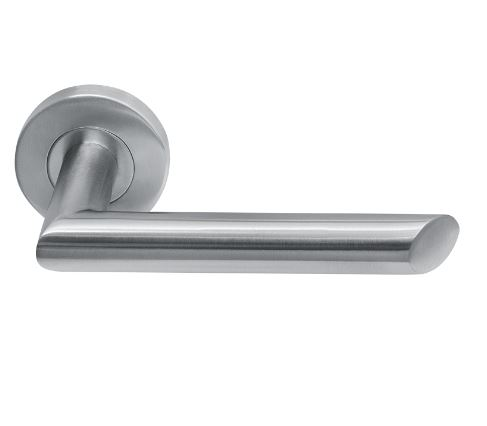 In-door deurkruk van massief RVS304 IND-208 (L90 afgeschuind) voorzien van stalen onderrozet en krukvering. Gleverd als set deurkrukken met ronde rozetten 53x8mm en kruksift 8mm. Kan ook gecombineerd worden met vierkante rozetten of langschilden
