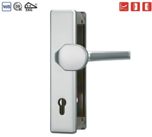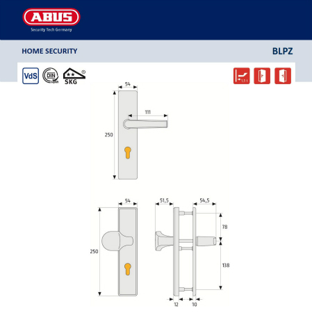 ABUS BLPZ 92/8 veiligheidsbeslag zonder kerntrekbeveiliging PC92. Het veiligheidsbeslag in de klasse ES1 voldoet aan de strengste keuringseisen van DIN 18257 in de klasse 1 en SKG**. ABUS design greepschild en design L-kruk