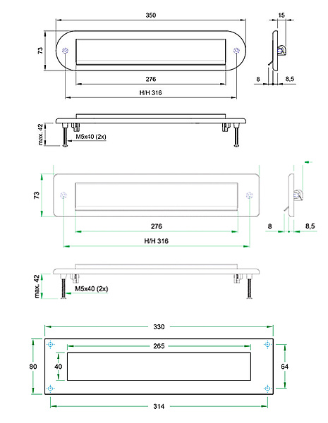 - Rechthoekige model (klep buitenkant deur): serie Quadra