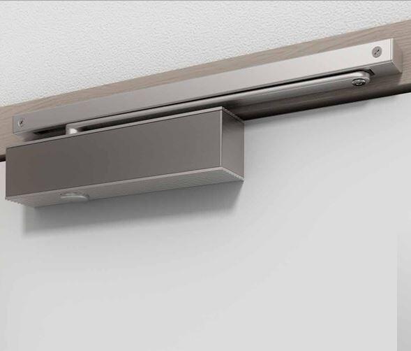 Maasland E-TS41 deurdranger of deurpomp met glijarm. Deze hydraulische TS41 deurpomp is ontworpen om de deur, nadat deze handmatig is geopend, automatisch te sluiten. Alle modellen zijn voorzien van een traploos instelbare sterkte, sluitsnelheid, eindslag en gefixeerde openingsdemping. Geschikt voor deurbreedtes tot 1100 mm en een maximum deurgewicht 80 kg