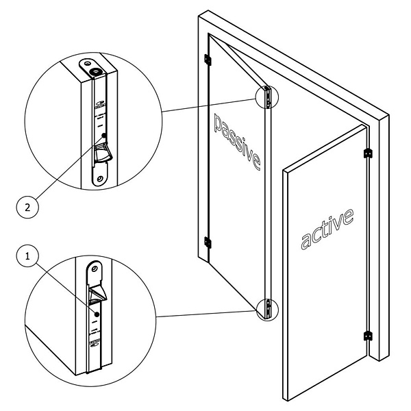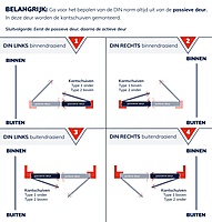 Voor de aanschaf is het belangrijk om te bepalen of je een type 1 of type 2 kantschuif nodig hebt. Dit is afhankelijk van de draairichting van de passieve deur. Per passieve deur heb je van beide types een kantschuif nodig. Voor een DIN rechtsdraaiende passieve deur gebruik je een type 1 kantschuif bovenaan en een type 2 onderaan de deur. Voor DIN links een type 1 kantschuif onderaan en type 2 bovenaan