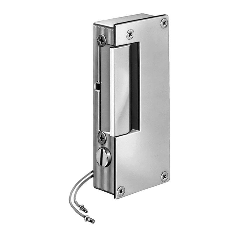 AMF 148A elektrische sluitplaat voor poorten. TYPE A Uitleg: de blokkeerstift houdt het slot ook na het afvallen van het contact ontgrendeld. De deur kan dus na het geven van een contact éénmalig geopend worden.