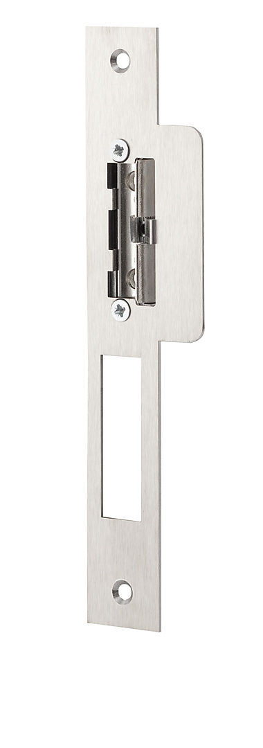 Elektrische deuropener met geïntegreerde schootgeleider die in het kozijn, tegenover de dagschoot van een mechanisch slot wordt ingebouwd, om deze te vergrendelen of te ontgrendelen. De schootgeleider duwt de dagschoot uit de schootvanger van de elektrische deuropener zodat, zonder lelijke uitsparingen in het kozijn, de deur kan worden ontgrendeld. De lange sluitplaat is speciaal gemaakt ter vervanging van de Nemef P646 rechthoekige sluitplaat.