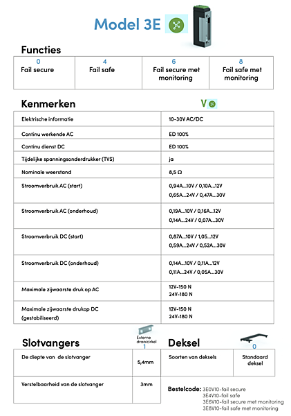 Elektrische arbeidsstroom ontsluiter 10-30V AC/DC - Fail secure 100% inschakelbaar. De deuropener kan zijwaartse druk weerstaan wat bijzonder nuttig is in combinatie met draaideurautomaten. Met of zonder deurpositiecontact verkrijgbaar. 3E0V10 en 3E6V10 Serie 3 Evolution is ontwikkeld als de eerste symmetrische ontsluiter.