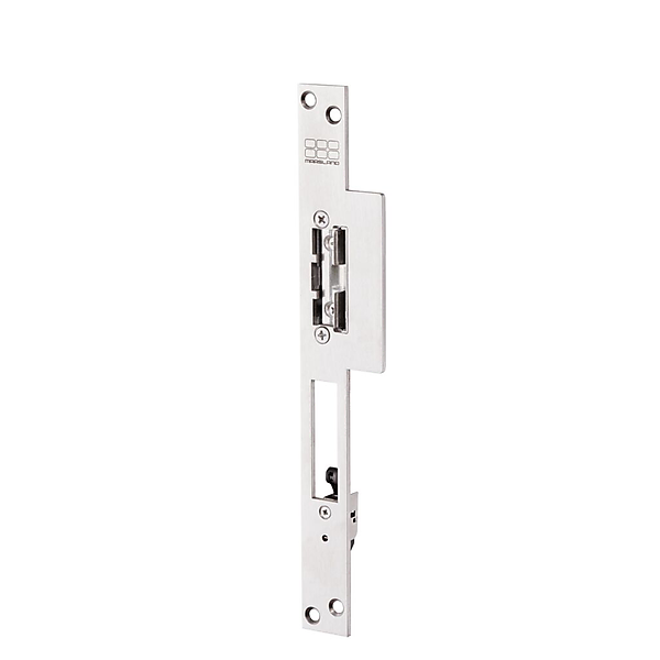 Lange lipsluitplaat met nachtschootsignalering. Verkrijgbaar in diverse varianten. Arbeidsstroom of ruststroom en vrijzetpal, openhoudfunctie of dagschootsignalering. Elektrische deuropener met geïntegreerde schootgeleider en universele spoel die in het kozijn, tegenover de dagschoot van een mechanisch slot wordt ingebouwd, om deze te vergrendelen of te ontgrendelen. De schootgeleider duwt de dagschoot uit de schootvanger van de elektrische deuropener zodat, zonder lelijke uitsparingen in het kozijn, de deur kan worden ontgrendeld. De lange lipsluitplaat is geschikt voor houten kozijnen en heeft een uitsparing voor de nachtschoot, zodat deze mechanisch kan worden vergrendeld. Tevens is de sluitplaat voorzien van een nachtschootsignalering. Hiermee kan men zien of de deur op het nachtslot is gedraaid of kan bijvoorbeeld het alarm worden ingeschakeld.