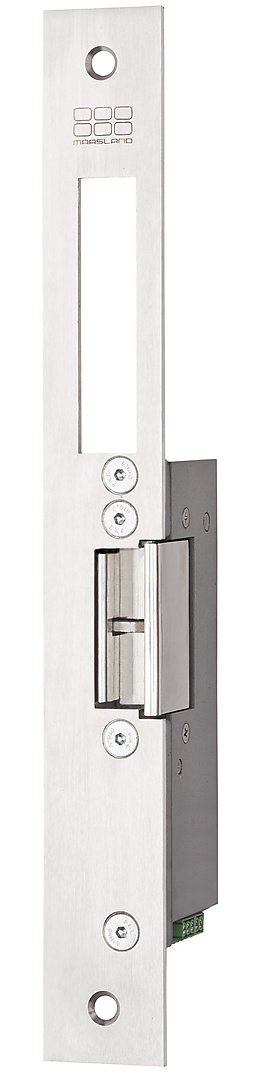 Maasland Elektrische nachtschoot deuropeners met lange sluitplaat. Deze nachtschootopeners kunnen elektrisch de nachtschoot van een mechanisch slot vrijgeven. Alle modellen werken volgens het ruststroomprincipe wat betekent dat de deuropener ontgrendeld bij spanningsuitval.