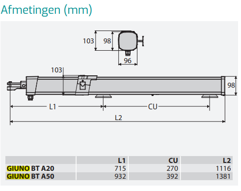 BFT Hydraulische lineaire aandrijving voor 'dichte' draaipoorten met knipperlicht. De GIUNO ULTRA BT A50 is een hydraulische aandrijving met 24 V voor scharniervleugels van maximaal 5m breed, 800 kg en is geschikt voor zeer intensief gebruik. De serie GIUNO is geschikt voor alle residentiële, industriële en huisvestingstoepassingen. Compact en robuust voor automatische bediening van draaipoortvleugels.