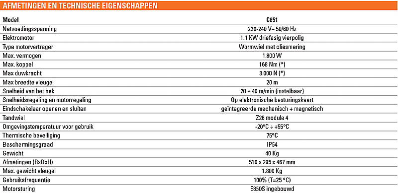 FAAC C851 230V SCHUIFHEKMOTOR : Schuifhekmotor (tot 1800kg), met snelheid tot 40m/min voor industriele toepassingen; 230V motor met electrorem, sturing E850S + frequentie-inverter, Z28 module 4 tandwiel, magne. eindeloopschakelaars, stalen huizing RAL9006Dit product wordt per stuks verkocht. (fr)