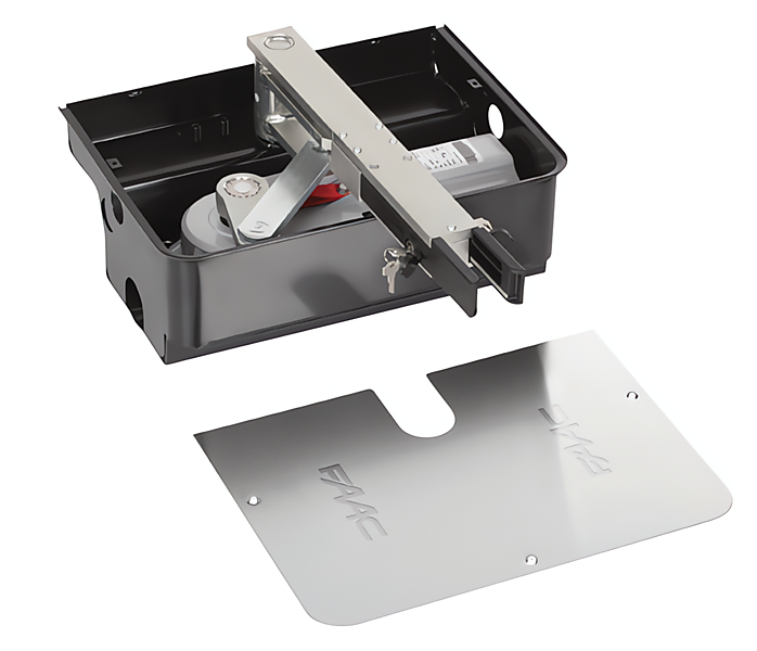 - 2 ondergrondse elektromechanische poortmotoren 770N inclusief behuizing en ontgrendelingsarm 110