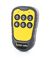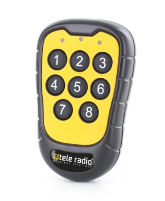 Handzender met aan/uit-schakelaar in een IP67 behuizing met clip, verkrijgbaar met 3, 6 of 8 1-staps knoppen. De handzender maakt gebruik van 2x 1,5V AAA batterijen.