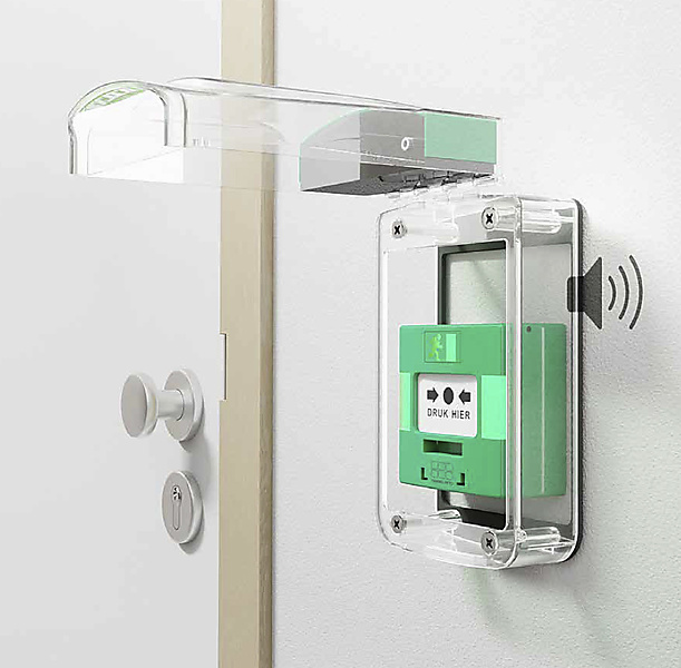 PS2000 Beschermkap voor handmelders. Deze beschermkappen zijn geschikt om over handmelders te plaatsen om ongeoorloofd gebruik tegen te gaan en hierdoor het aantal valse meldingen te reduceren. Door het openen van de deksel gaat het alarm af en is de handmelder of ander te schakelen materiaal te bedienen. De beschermkappen worden geleverd met een groen en rood inzetstuk met Nederlandse tekst zodat er 1 model is voor zowel groene als rode handmelders. Het groene inzetstuk is voor nooddeuren en de rode voor brand. Verder zijn de beschermkappen voorzien van LED indicatie en buzzer met instelbaar volume. Het model is sproeiwaterdicht volgens IP65.