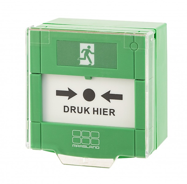 Noodverbreekschakelaar 2002SG van Maasland Standaard resetbare handmelders. Deze nooddrukkers zijn geschikt om in geval van calamiteiten een deur te ontgrendelen. Door op het witte plaatje van de nooddrukker te drukken schakelt de handmelder.