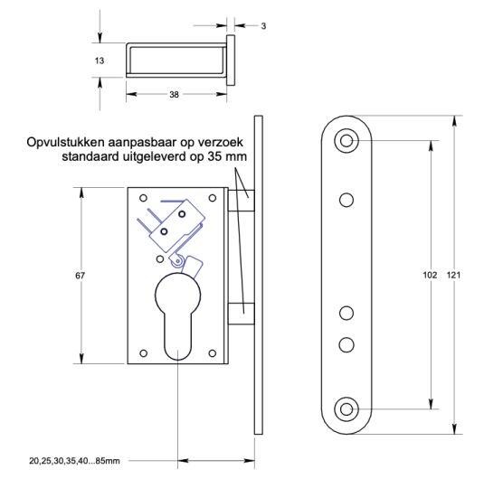 | 11. | Afmetingen L x H x D voorplaat: 121 x 24 x 3mm |
