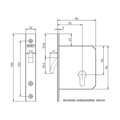 Nemef 688-55 SCHUIFDEURSLOT voor Schuifdeuren. Ruim assortiment haaksloten verkrijgbaar. Nemef schuifdeursloten van goede kwaliteit met mee geleverde sluitplaat