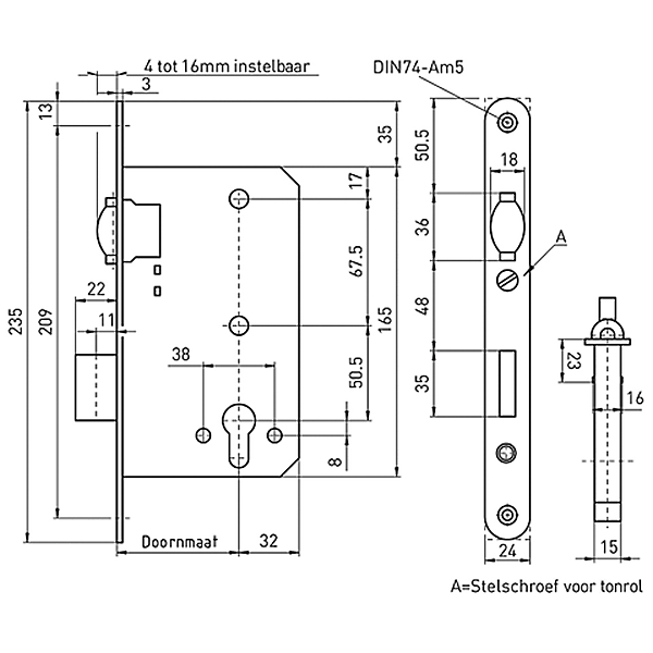 MAUER 2889 pendeldeurslot of tonrolslot met maatvoering conform utiliteitsbouwsloten. MAUER pendeldeurslot is alleen verkrijgbaar met voorplaatbreedte 24mm