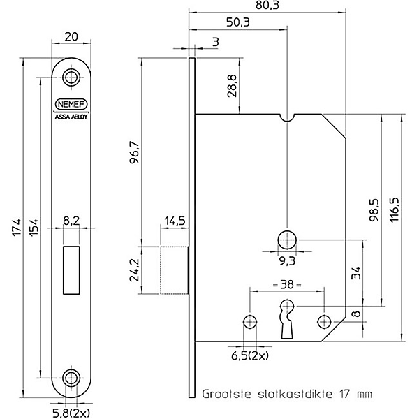 Nemef kastslot sleutelgat 55 mm doornmaat 50 mm 1256/5 (fr)