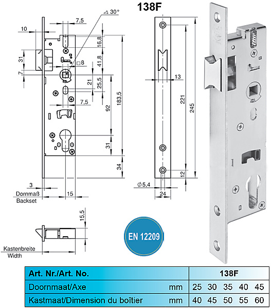Wilka 138F loopslot. Insteekslot of dagschootslot voor profieldeuren compleet verzinkt. Met 8 mm tuimelaar eendelig met wissel en dagschoot omlegbaar. De slotkast is boven en beneden gesloten met doorlopende schroefgaten. Gekeurd conform EN 12 209. Wilka 138F cilinderloopsloten in diverse doornmaten beschikbaar
