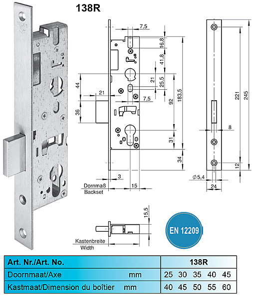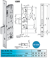 Wilka 138R nachtschootslot. Wilka 138R nachtslot met cilinderbediende nachtschoot. Insteekslot in diverse doornmaten beschikbaar. Insteekslot voor profieldeuren, geschikt voor profielcilinders, compleet verzinkt, 1-toers = 20 mm nachtschootuitworp, slotkast boven en beneden gesloten, doorlopende schroefgaten. Gekeurd conform EN 12 209.