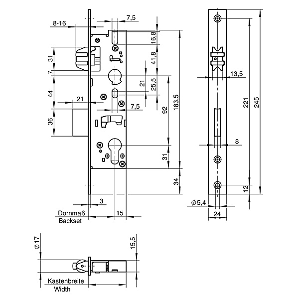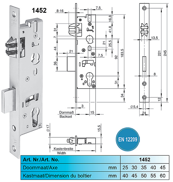 Instelbereik van de dagschoot 8-16mm, 1-toers = 20 mm nachtschootuitworp, slotkast boven en beneden gesloten, doorlopende schroefgaten. Gekeurd conform EN 12 209. wilkainsteekslot wilkasmaldeurslot