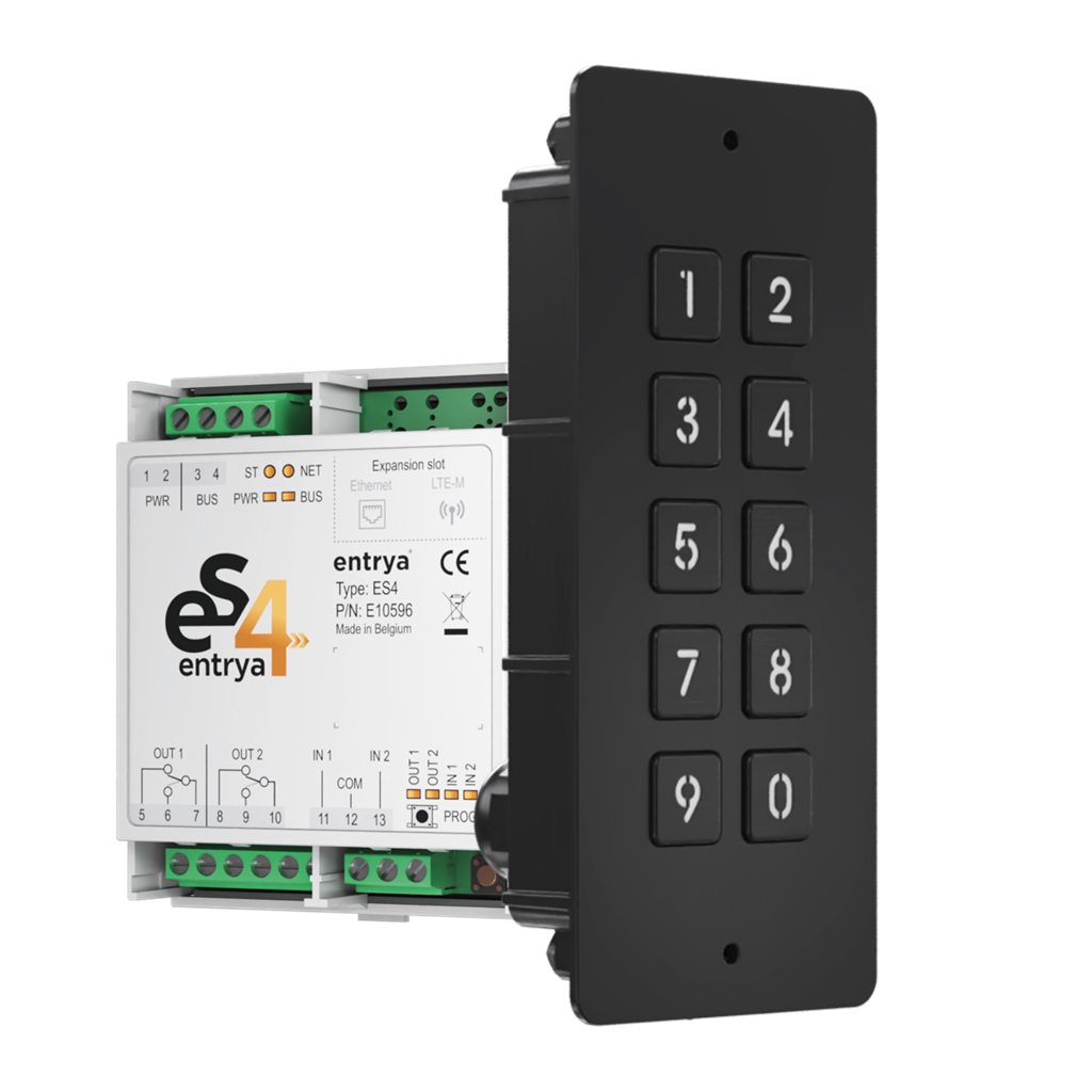 Entrya ES4-KPFB kit met zwart inbouw codeklavier. Het ES4-codeklavier is een betrouwbare en gebruiksvriendelijke oplossing voor toegangscontrole tot 2 deuren en 100 codes.