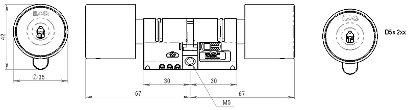 ILOQ Europrofiel dubbele cilinder (30/30 mm), SB met twee RTC's. De zelfaangedreven iLOQ D5-cilinder genereert de benodigde elektrische energie uit de insteekbeweging van de sleutel. Via de D2D-commuicatie is het mogelijk om de blocklist bij te werken.