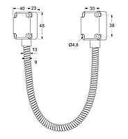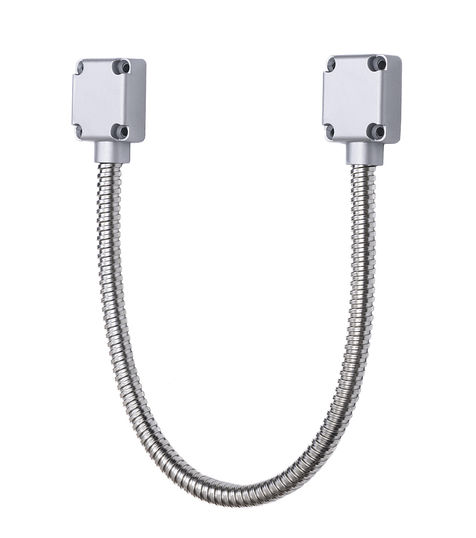 Maasland DLS50M kabelovergang. Deze kabelovergangen zijn bedoeld om de bekabeling van de deur naar het kozijn over te brengen. Dit gebeurt door een flexibele roestvast stalen slang zodat de bekabeling niet beschadigd. Voorzien van zinken eindstukken.