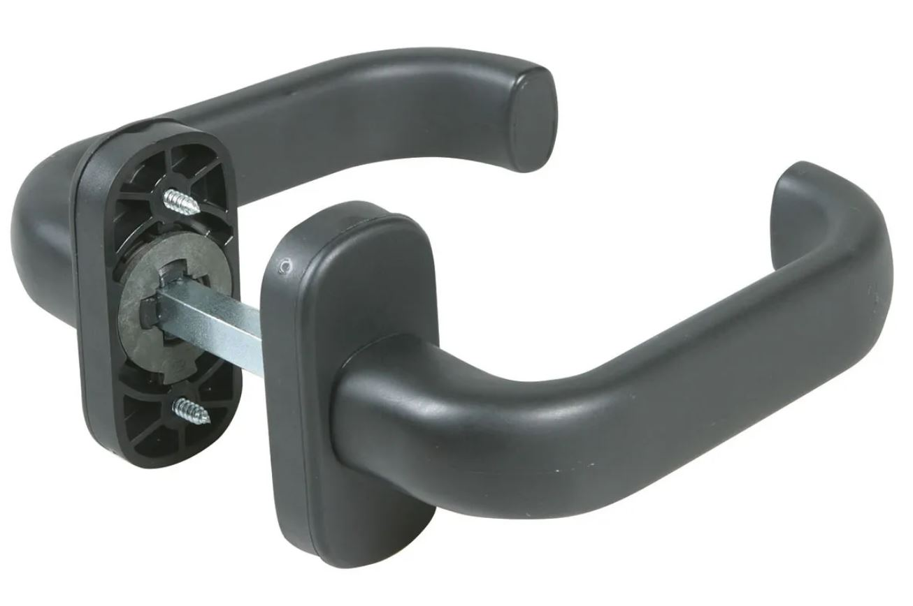 Klinkstel op rozet met geveerde klink. Polyamide krukpaar bevestigt door middel van schroeven. Kleur zwart met 8mm krukstift voor deuren van ca 4cm.