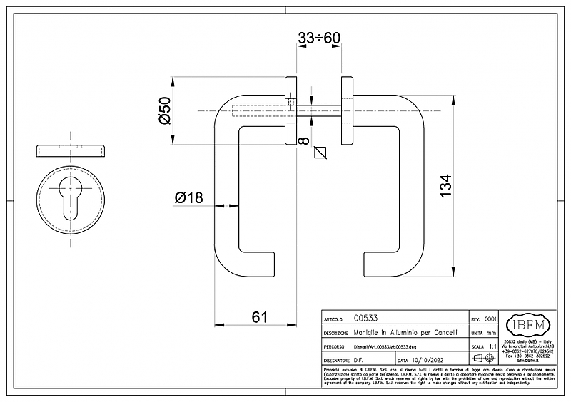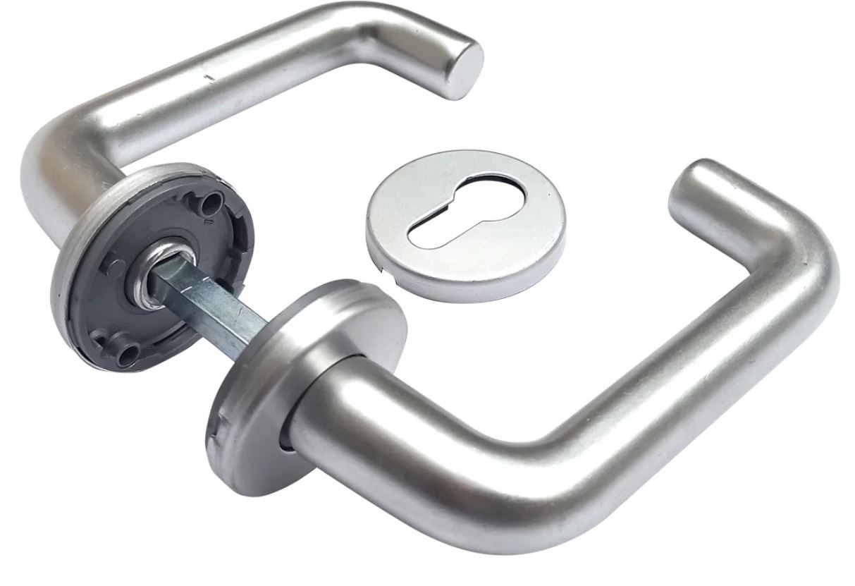 Poortklink op rozet. Elegante aluminium handgreep geschikt om op poorten en metalen deuren te schroeven. Montage van het klinkstel op rozet wordt vergemakkelijkt door een kunststof mondstuk dat vervolgens wordt bedekt door de roestvrijstalen rozet.