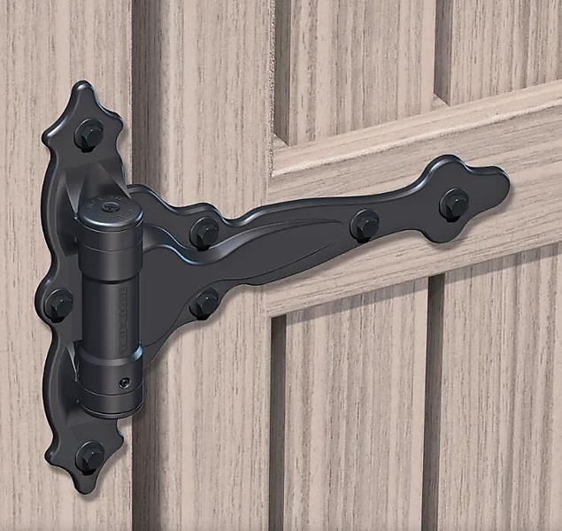 Truclose DecoMold veerscharnier voor sierpoorten met instelbare veer verpakt per 2 stuks. Maximaal zelfsluitend gewicht 25kg. Zelfsluitend scharnier geschikt voor bevestiging op houten poorten. Eenvoudige montage en instelbare sluitkracht. TruClose DecoMold Decoratief veerscharnier.