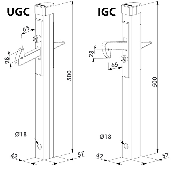 Locinox poortvanger UGC en IGC. De regelbare vanghaak kan eenvoudig omgekeerd worden. Stootrubber en kunststof valhaak verhinderen beschadiging aan de poort. Eenvoudig in te betonneren. Deurvanger voor profielen van 40 mm tot 60 mm. Voorzien van een hoogte verstelbaarheid van 40 mm.