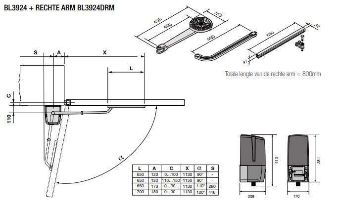 Cardin KT-BL3924MCD Kit Elektromechanische knikarmaandrijving 24V met rechte arm voor situaties waar een beperkte ruimte achter de poort is. Geschikt voor poortvleugels tot 500KG en 5 meter. Uitermate geschikt voor poorten waarbij achter de vleugels te weinig ruimte beschikbaar is door bijvoorbeeld een muur.