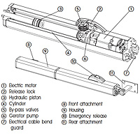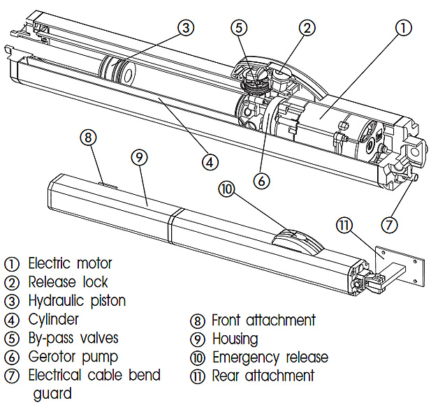 Elektro-hydraulische faacaandrijving, 230V voor dubbele hekken, collectief- en industrieel gebruik. Exclusieve hydraulische inklemmingsbeveiliging. Manuele ontgrendeling d.m.v. sleutel.