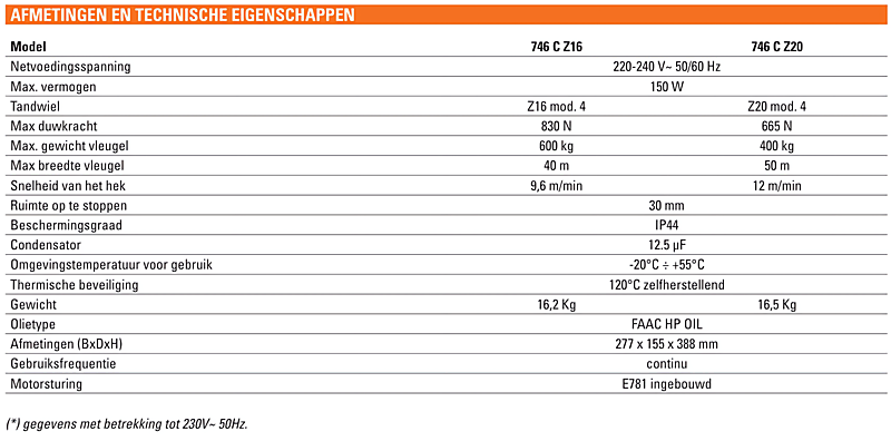 FAAC 746C Z16 Schuifhekopener 230V met inbouwsturing E781 + tandwiel Z16, magneten voor eindaanslag, cond.12,5uF - instelbare snelheidsregelingniveaus; 2 ingangen voor rechtstr.aansluiting 2 veiligheidslijsten (NC of 8,2kOhm); compatibel met SimplyConnect & FDS radiotechnologie