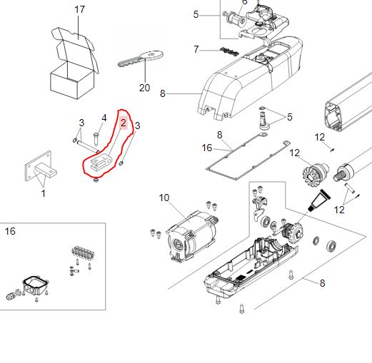 FAAC bevestigingsbeugel ten behoeve van poortaandrijvingen. DIE-CAST REAR FORK Artikel 7228015Let op betreft onderdeel 2 (rood omcirkeld)