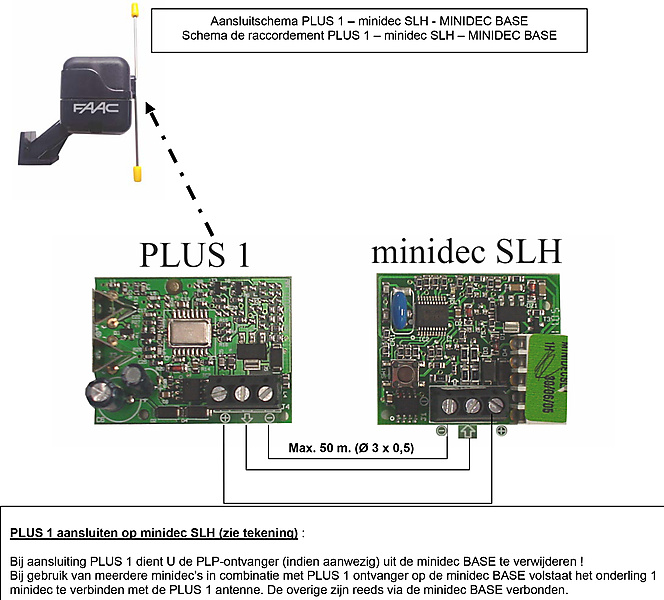 Minidec SLH Faac Decodeerkaart 785532. De minidec SLH dient o.a in combinatie met de PLUS 1 antenne van FAAC aangesloten te worden