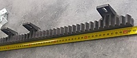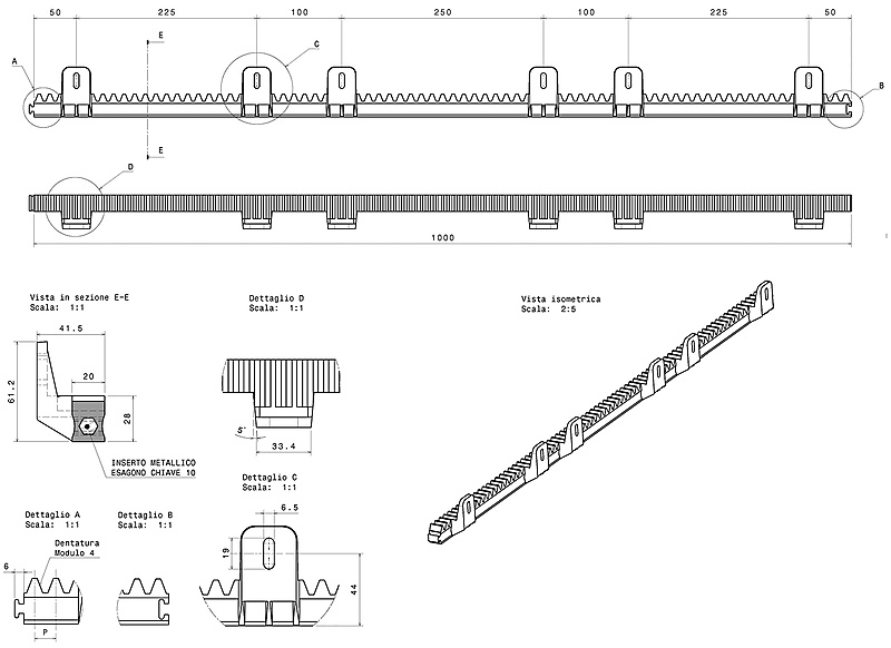 Tandheugel V6 ondermontageToepasbaar voor schuifpoorten. De V6 tandlat is vervaardigd van grijs nylon (module 4) met een stalen kern. De tandheugel is 1 meter lang, geschikt voor ondermontage en tot 800 kg. De tandheugel is voorzien van 6 bevestigingspunten en wordt geleverd met een set bevestigingsmateriaal